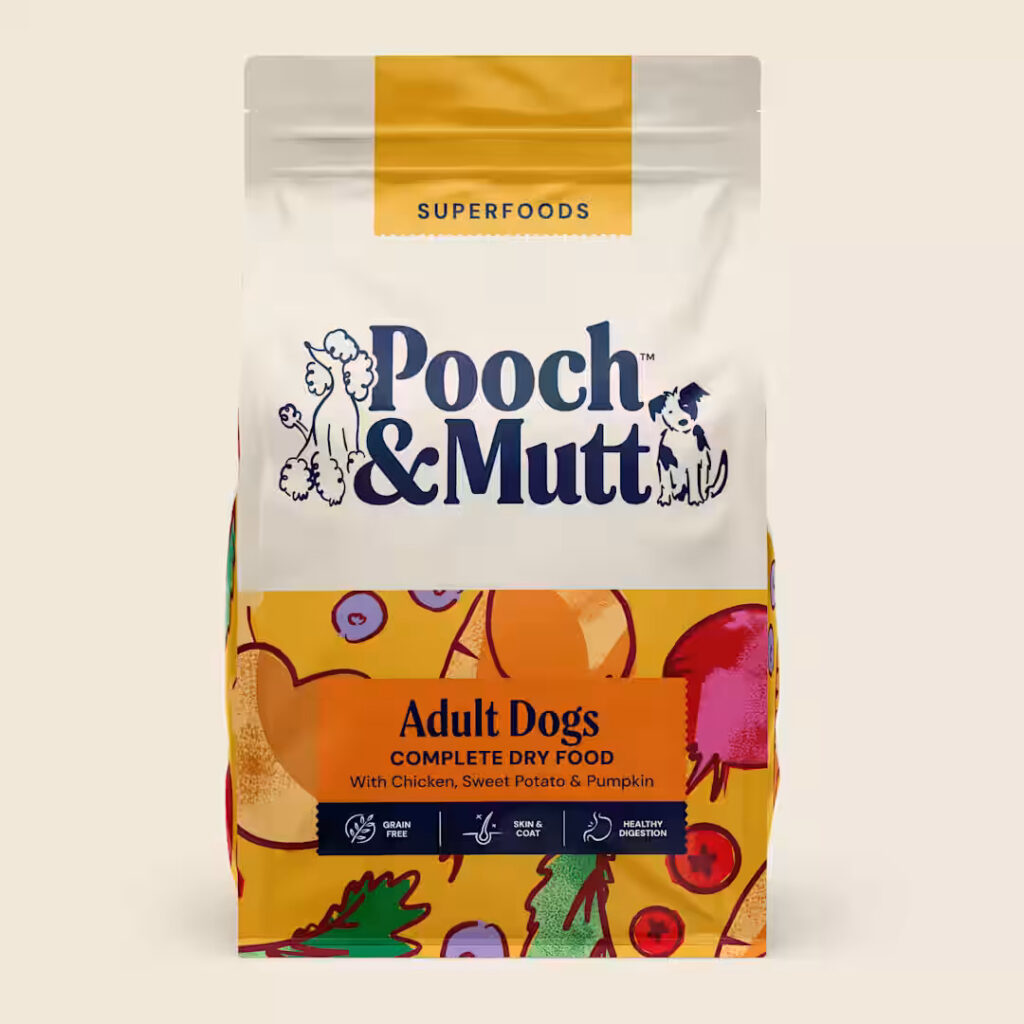 Grain free, junk free πλήρης ξηρή τροφή με κοτόπουλο και υπερτροφές για ενήλικους σκύλους.