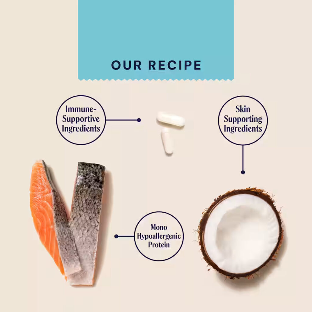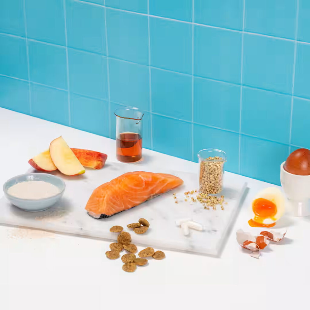 Σύνθεση: Μπιζέλια (48%), ταπιόκα (20%), γλυκερίνη φυτικής προέλευσης (18%), φυστικοβούτυρο χωρίς ξυλιτόλη (6%), υδρολυμένες μαγιές (6%), λιγνοκυτταρίνη (2%), αλεύρι μπιζελιού, αδρανοποιημένο βακτήρια και μέρη τους (Lactobacillus helveticus HA – 122, 15×109 κύτταρα/kg).